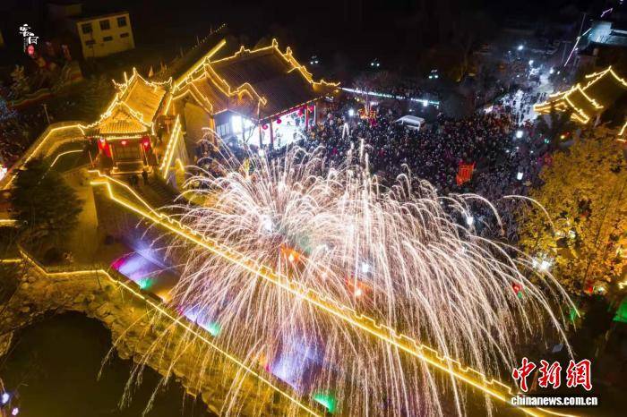图为打铁花展演。(无人机照片)中新社发 王金生 摄