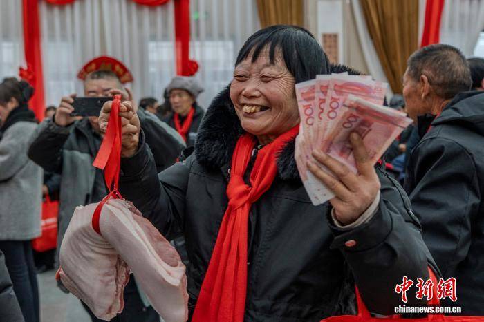 2月10日,正值中国农历北方小年,在河南登封被誉为“微短剧村”的袁桥村,一场传统年味与现代拍摄交织的景象在此上演。村里为170余位65岁以上老人准备了新年礼金、团圆宴及民俗展演,传递着温暖与尊老之情;与此同时,三组微短剧团队也在村中同步取景拍摄,镜头内外皆是戏。据悉,2024年以来,已有50多部微短剧在袁桥古村完成拍摄。图为村民展示领取的新年礼金、猪肉等礼品。中新社记者 李超庆 摄