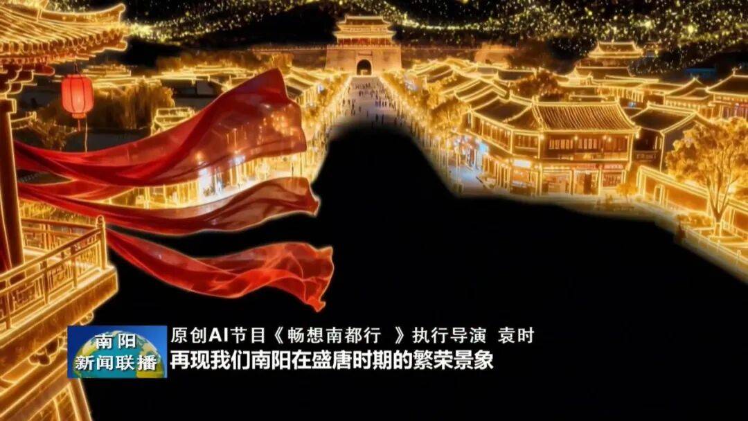 【原创AI节目《畅想南都行》执行导演 袁时:我们就是想采用这个全息的环境,然后再配合到灯光的、空间的运用,结合到舞蹈,就再现我们南阳在盛唐时期的一个繁荣的景象。】