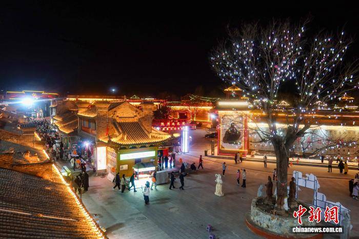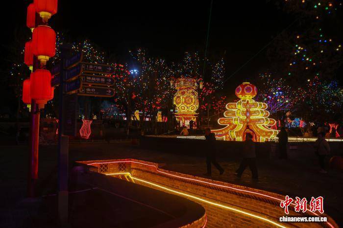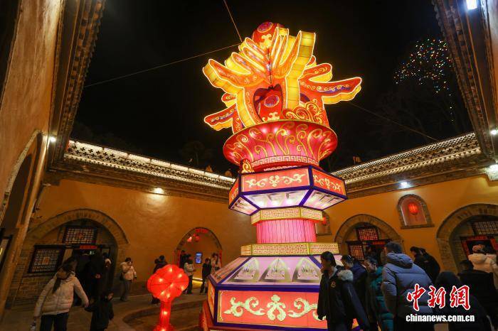 2月10日小年夜,河南三门峡第九届陕州灯会正式开启,流光溢彩的花灯将地坑院映照得绚烂夺目,吸引众多游客观看。图为游人夜观花灯。孙猛 摄
