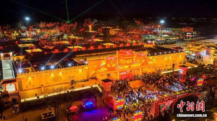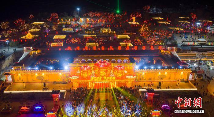 2月10日小年夜,河南三门峡第九届陕州灯会正式开启,流光溢彩的花灯将地坑院映照得绚烂夺目,吸引众多游客观看。图为陕州地坑院花灯璀璨。(无人机照片)孙猛 摄