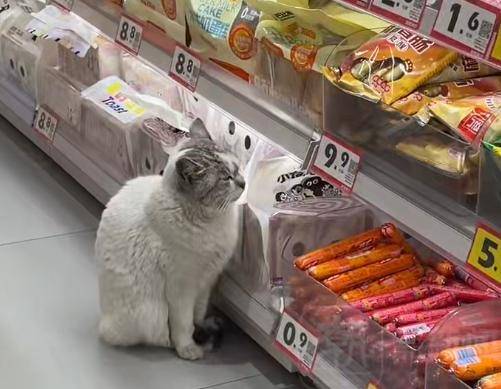 它每天定时来到火腿肠货柜前蹲坐,眼巴巴地盯着货架,一副“望肠止馋”的乖巧模样。