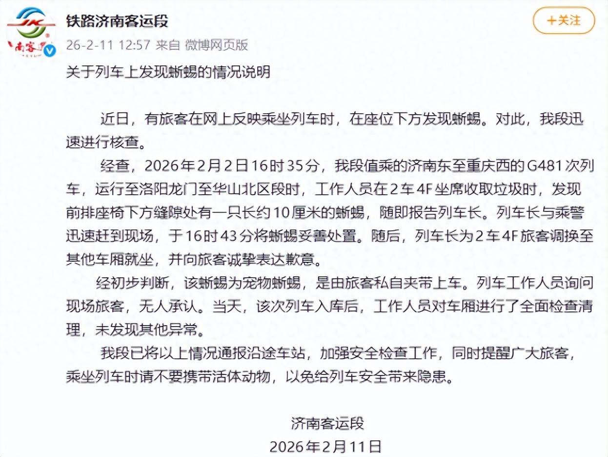 经查,2026年2月2日16时35分,我段值乘的济南东至重庆西的G481次列车,运行至洛阳龙门至华山北区段时,工作人员在2车4F坐席收取垃圾时,发现前排座椅下方缝隙处有一只长约10厘米的蜥蜴,随即报告列车长。列车长与乘警迅速赶到现场,于16时43分将蜥蜴妥善处置。随后,列车长为2车4F旅客调换至其他车厢就坐,并向旅客诚挚表达歉意。