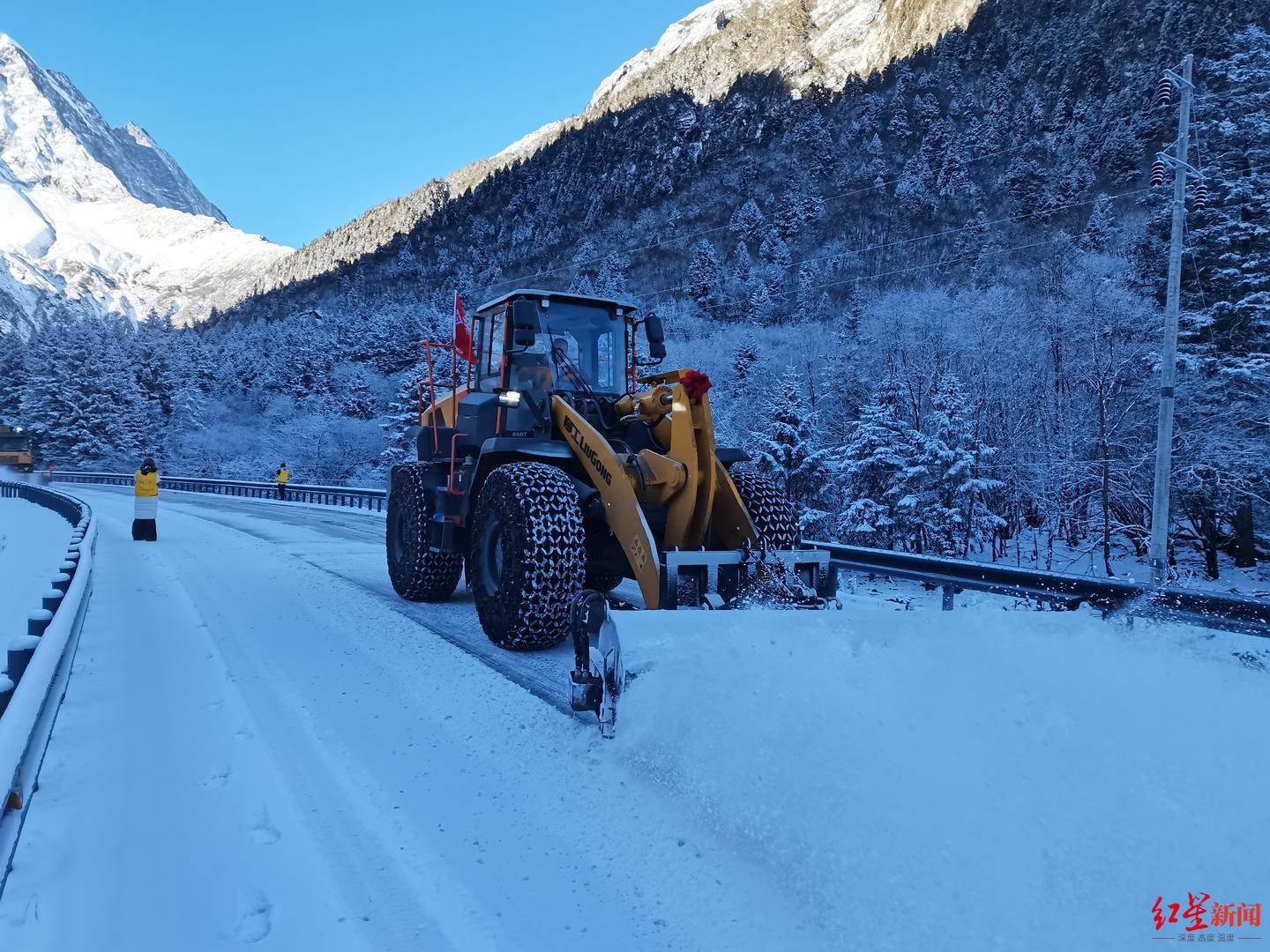 这份温暖的背后,是周锟和同事们刻在骨子里的责任。2月初,理县迎来降雪,国道317线部分路段及理小路出现七八公分厚的积雪,路面结冰严重,影响通行。周锟与同事们清晨6点便从养护站出发,分三组开展除冰融雪作业,他们背着融雪剂、扛着盐巴,一路撒布、一路清理,不仅完成了本站负责的10余公里冰雪路段除冰,还主动支援其他路段,累计处理冰雪路段30多公里。从清晨到下午1点,7个小时的连续作业,让原本封路的理小路顺利恢复畅通,也让国道317线的通行秩序快速回归正常,为前往理县的游客扫清了道路障碍。