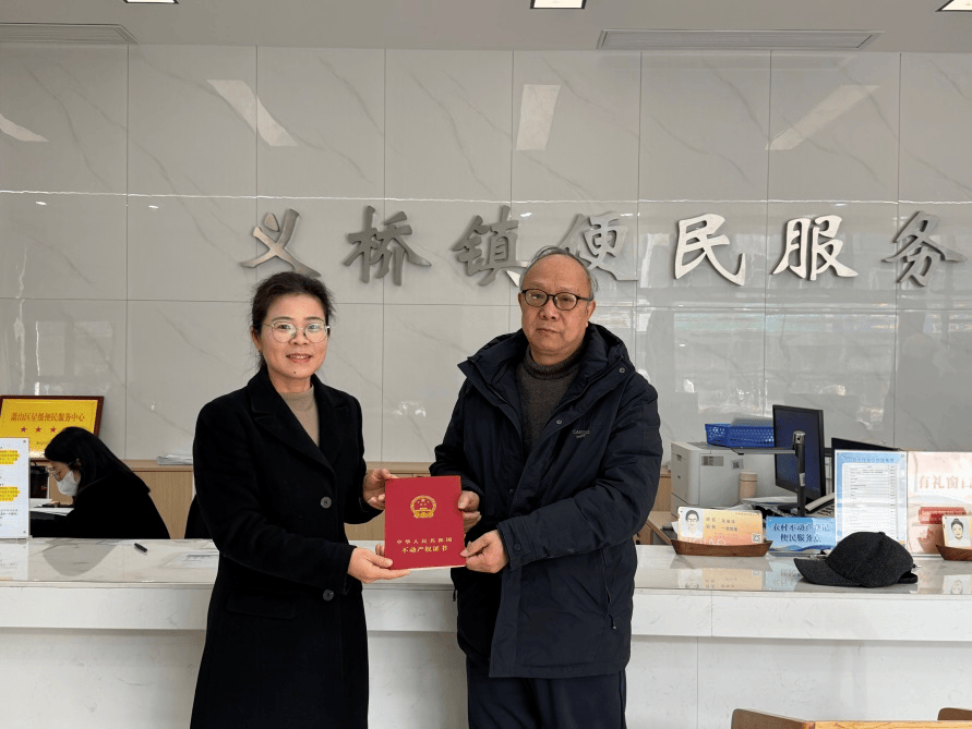 近日,义桥镇的黄先生一家在镇便民服务点顺利领取了崭新的 宅基地及房屋不动产权证书。服务点工作人员介绍道:“现在越来越多的村民像黄先生一样,先来我们这儿咨询怎么办证、要准备哪些材料。我们不仅提供全流程指导,还能帮忙打印所需表单,让大家少跑路。材料齐了之后,很多业务在‘家门口’就能直接办理,不用再往城区跑,真正实现了‘就近问、就近办’。”