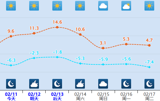 全市晴天,最低气温-12~-6℃,最高气温8~11℃。
