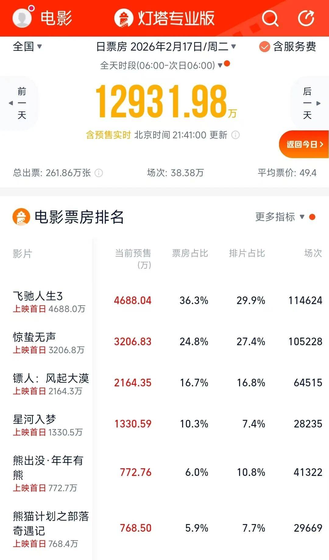 再来看看大年初一的预排片情况。预计当天总场次将在54万左右,目前已预排七成。《飞驰人生3》《惊蛰无声》《镖人:风起大漠》《熊出没·年年有熊》占据前四位,《星河入梦》和《熊猫计划之部落奇遇记》相近的格局,也基本确定了。