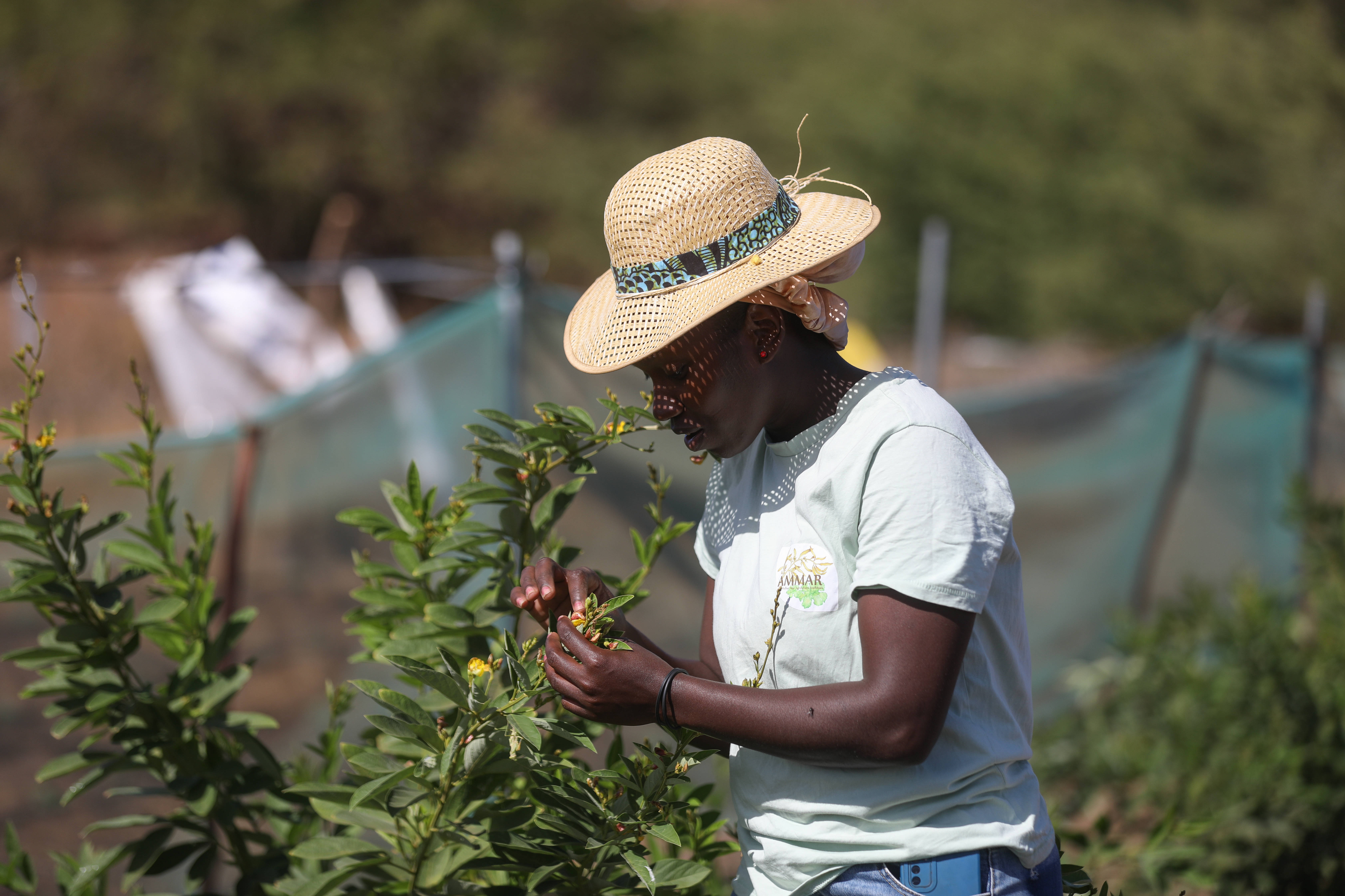 2月11日,在佛得角圣地亚哥岛圣多明戈斯市莫亚莫亚社区试验田,一名妇女在农田里检查作物枝叶。 新华社发(埃尔顿·蒙泰罗摄)