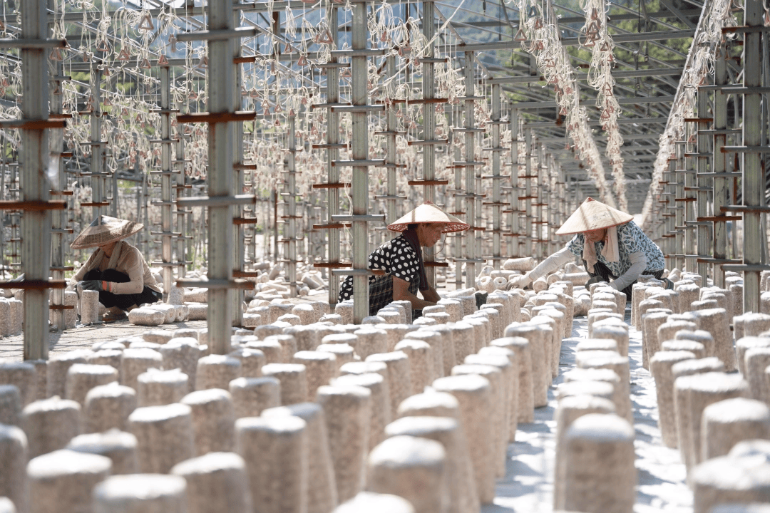 村民在万山中华山村的食用菌种植基地里摆放菌棒。