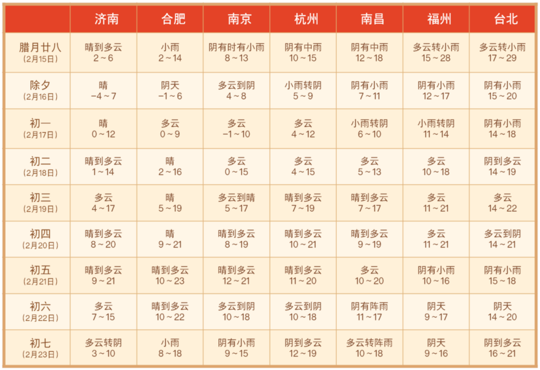 春节期间两头雨,中间多云到晴,整体气温偏高,气象条件总体适宜。