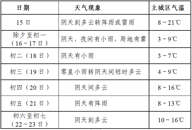 春节假日期间,我省天气总体平稳,无低温雪凝天气。 假日前期(15日夜间至18日) 受冷空气影响气温逐步下降,过程降幅6~12℃,但最低气温大部地区在0℃以上,全省白天以阴天间短时多云天气为主,夜间有小雨,关注中西部雨雾天气对交通的影响;假日后期(19日至23日)以多云间阴天为主,气温逐步回升,但21日中东部有明显降雨。