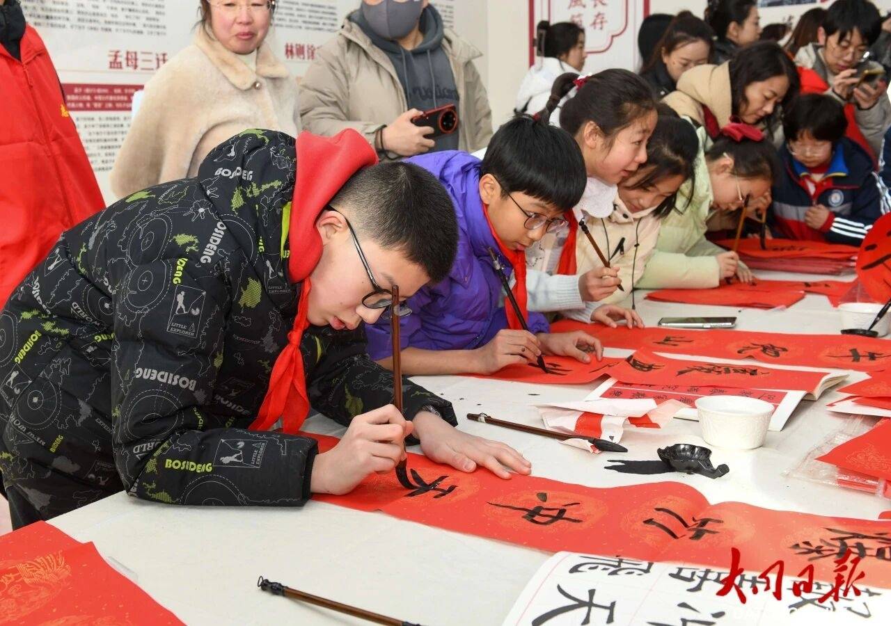 活动现场特别设置“少儿创作角”与“书法家惠民区”,让乡亲与孩子们沉浸式体验书香与年俗交融的双重喜悦。在创作角里,低龄孩童手握彩笔,细心勾勒门神画像,一笔一画描绘出新春的守护与吉祥;青少年展纸挥毫,书写春联与福字,将淳朴心愿落墨成章。