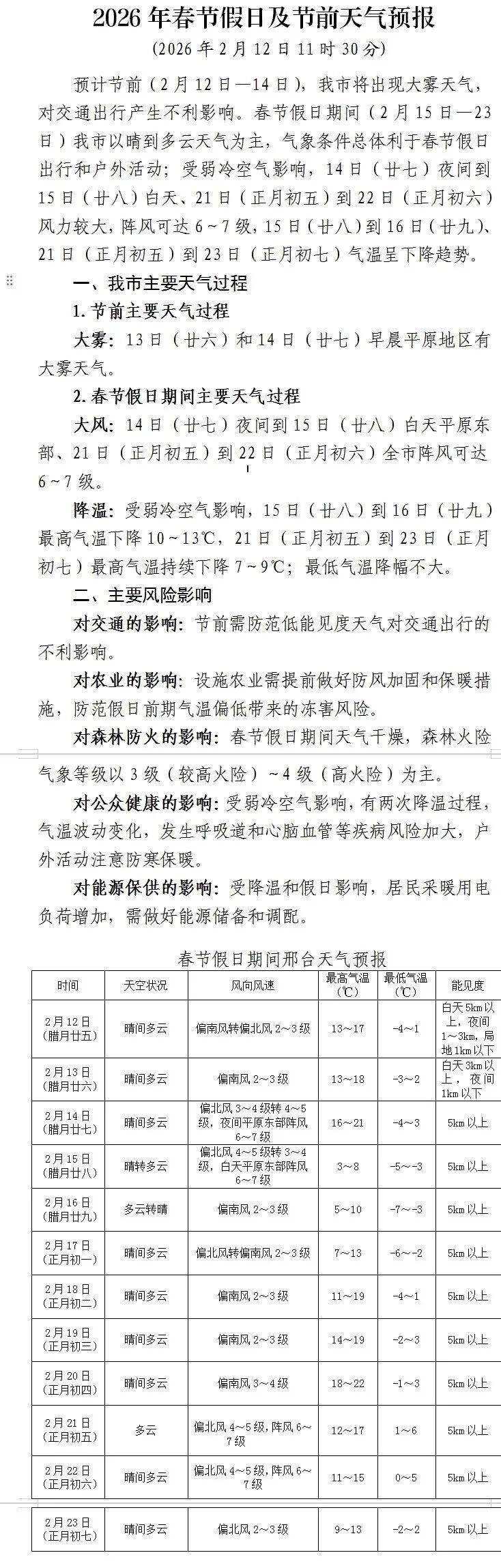 大风、降温、有雾,春节假日及节前天气预报→