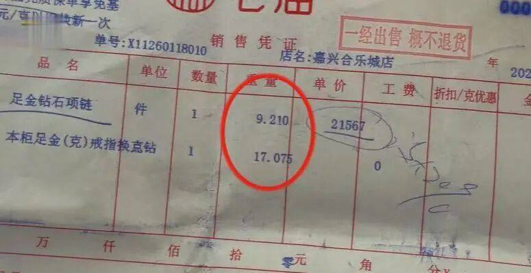 颜阿姨的女儿朱女士说,她当时也在场,瞥见单据上写着“9点几克”,曾提出疑问。销售人员当时回复“就是17克的”。发现克重严重不符后,母女俩返回金店理论。