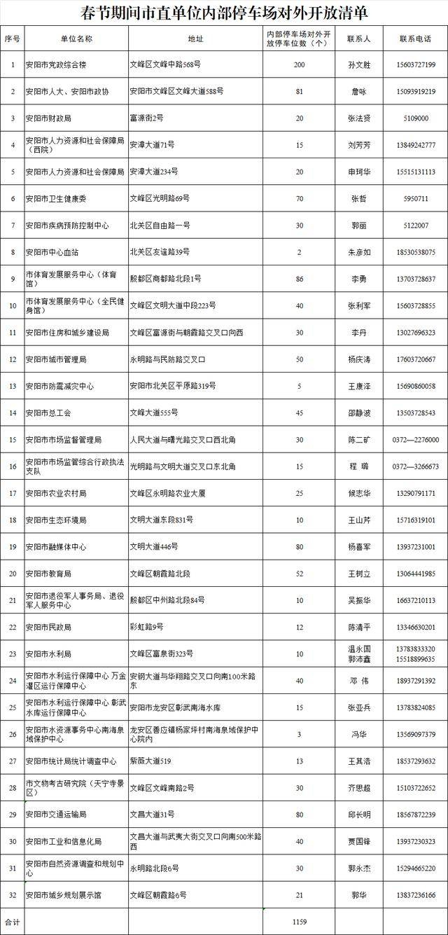 安阳市直单位和各县(市、区)公共机构内部停车场开放清单如下:
