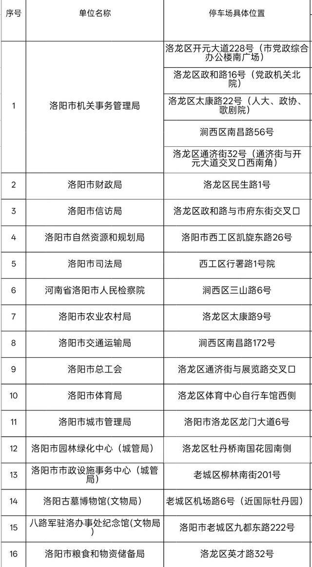 春节假期,洛阳市机关事务管理局、洛阳市城市管理局、洛阳市体育局、洛阳市交通运输局等34个机关事业单位的停车场将免费向游客开放,共计提供泊位2000余个,让停车资源开放共享惠及更多游客。
