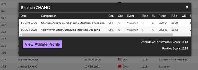 支撑张水华排名大幅上涨的核心依据,来自两场含金量充足的正式赛事。一场是去年东营马拉松,她以2小时33分43秒的成绩完成比赛,为世界排名积累了关键积分。另一场则是今年的重庆马拉松,她跑出2小时30分54秒的个人最佳表现,这一成绩也被世界田联正式认定为个人最好成绩。
