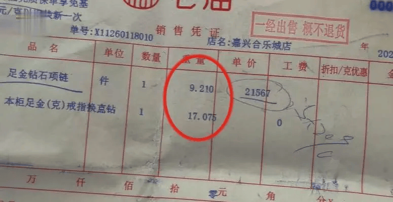 然而回到家后,颜阿姨和家人总觉得项链轻飘飘,仔细核对单据发现:新项链实际重量只有9.21克,与她预期的17克相差近8克。