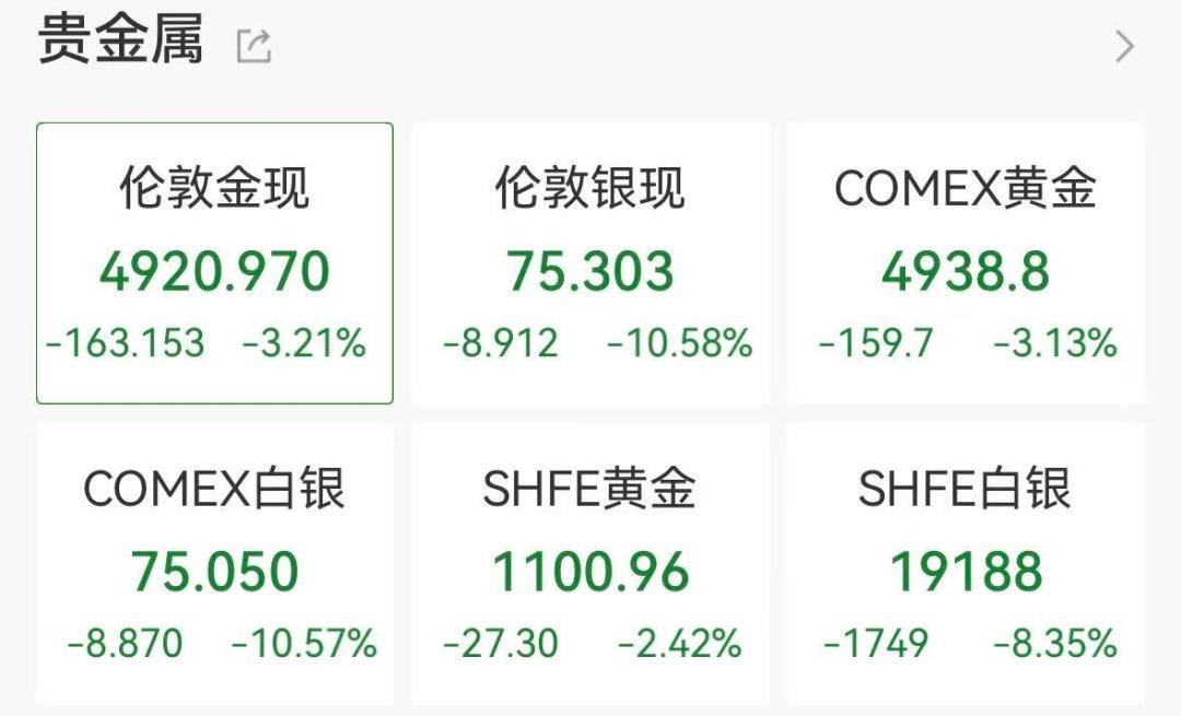 大宗商品市场同步震荡。现货白银价格暴跌10.73%,报75.224美元/盎司;金价下跌3.17%,跌破5000美元关口。原油期货收跌约2.7%,WTI原油报62.84美元/桶。交易员重新评估美联储政策路径,CME美联储观察显示6月前降息概率不足50%。