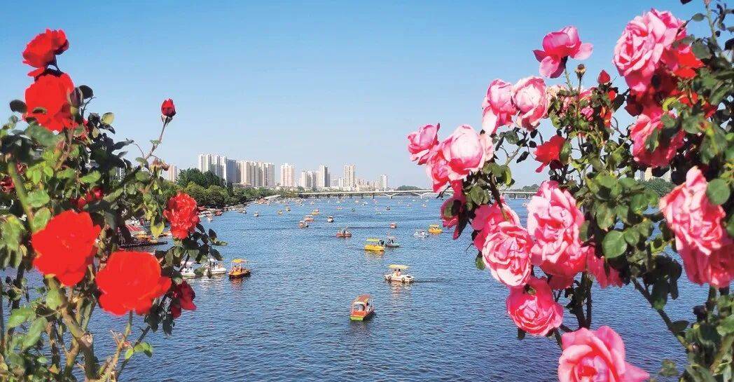 月季大道如锦带铺展,上千个品种在此安家。“绯扇”开得端庄,“节日礼花”热烈奔放,藤本的攀上廊架,垂下万千花瀑,微型月季在花钵里攒成玲珑绣球。白河两岸,花与水的光影交织,连空气都酿成了蜜。