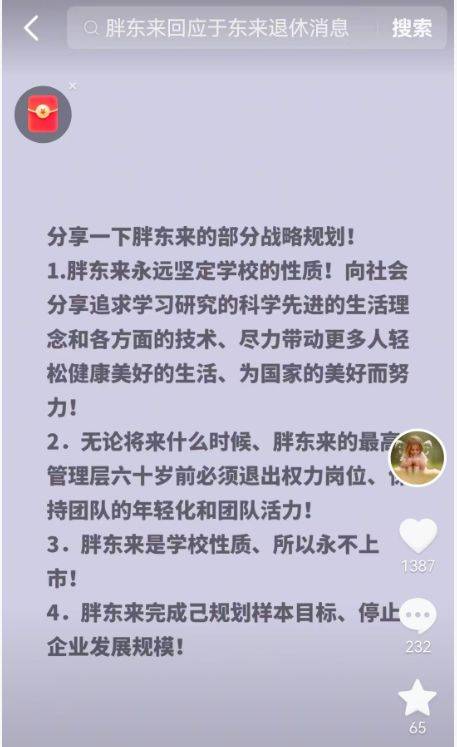 2月12日晚间,继官宣年后退休后,胖东来创始人于东来在社交平台分享了胖东来的部分战略规划,称胖东来永远坚定学校性质,永不上市。胖东来最高管理层六十岁前必须退出权力岗位。此外,于东来还表示,胖东来完成已规划样本目标,停止企业发展规模。