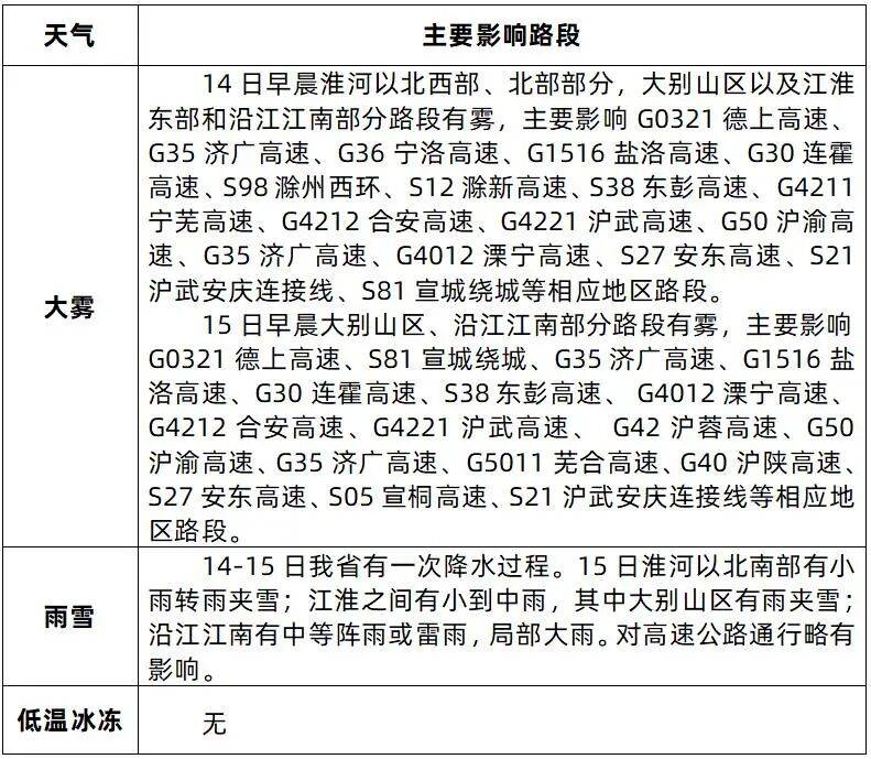 14-16日我省有一次降水过程,其他时段全省以多云到晴天气为主。14日江南南部有小雨。15日淮河以北南部有小雨转雨夹雪;江淮之间有小到中雨,其中大别山区有雨夹雪;沿江江南有中等阵雨或雷雨,局部大雨。16日大别山区和江南还有弱降水。
