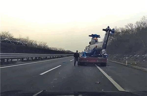 快科技2月13日消息,网友“kiss木子”公布的行车记录仪视频显示,2月7日,湖北某高速路段,一辆半挂卡车,为躲避前车急刹追尾,在向右侧紧急变道时,撞上了一辆运输直升机的货车。