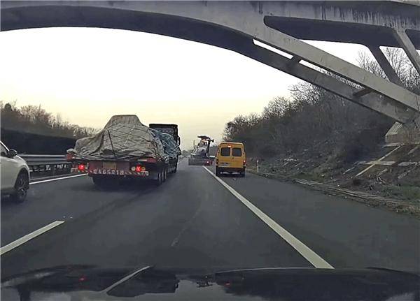 视频中,这辆运输直升机的货车,从高速服务区驶出后,一直在高速的最右侧车道行驶。