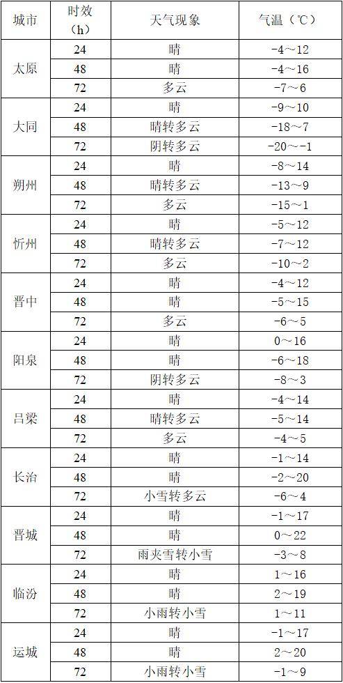今天下午到夜间:全省晴天间多云。最高气温:北部及中南部山区10~14℃,中南部其余地区14~18℃;最低气温:北部及中南部山区-9~-3℃,中南部其余地区-3~2℃。