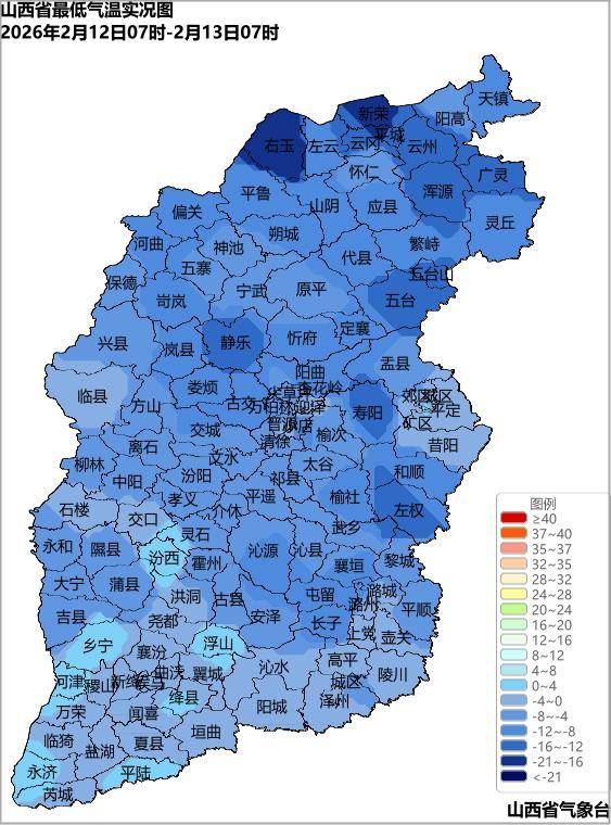 2月12日07时至13日07时,全省各地最低气温介于-17.6℃(右玉)~2.9℃(乡宁)之间。太原、大同、长治、晋城、朔州、晋中、忻州和吕梁的全域,阳泉、运城和临汾的大部共110个县(市、区)最低气温在0℃以下,其中,代县、和顺、朔城区、小店区、左云、定襄、灵丘、偏关、河曲、岚县、阳曲、娄烦、沁源、岢岚、寿阳、静乐、广灵、浑源、平城区、左权、五台、云州区、云冈区、新荣区、右玉共25个县(市、区)在-10℃以下。