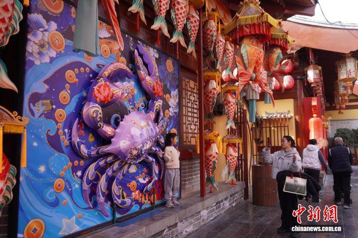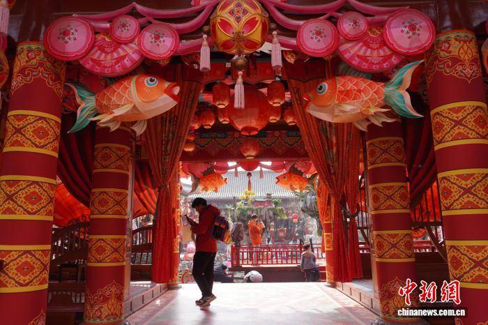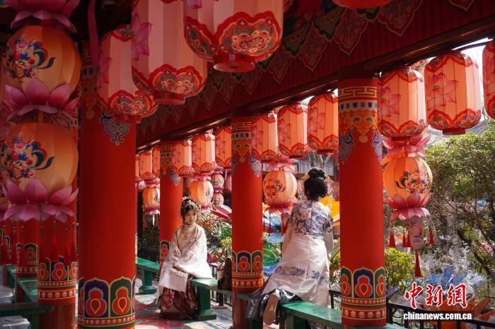 图为游客在挂满灯笼的连廊里拍照。中新社记者 韩章云 摄