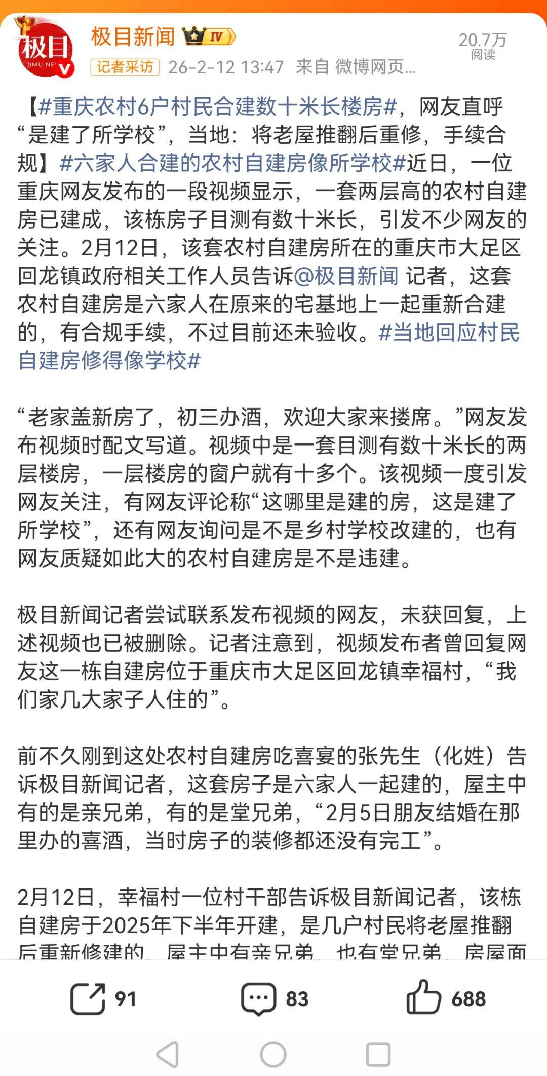 据新闻报道,2月12日,幸福村一位村干部告诉极目新闻记者,该栋自建房于2025年下半年开建,是几户村民将老屋推翻后重新修建的,屋主中有亲兄弟,也有堂兄弟,房屋面积在老宅面积基础上,根据新增的户籍人口有增加,“手续都是齐全的,已经上交好几个月了。”