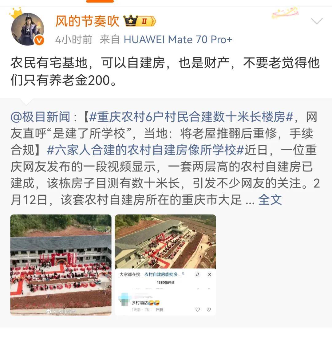 正如网络大V“风的节奏吹”所言:“农民有宅基地,可以自建房,也是财产,不要老觉得他们只有养老金200。”