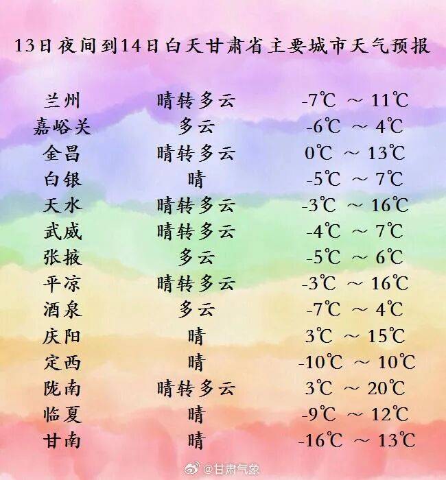 今天夜间到明天白天(02月13日20时-02月14日20时),全省各地多云或晴,酒泉市有 4-5 级偏东风,武威、白银、兰州、庆阳等市有 4-5 级偏北风;河西五市局部地方有沙尘。