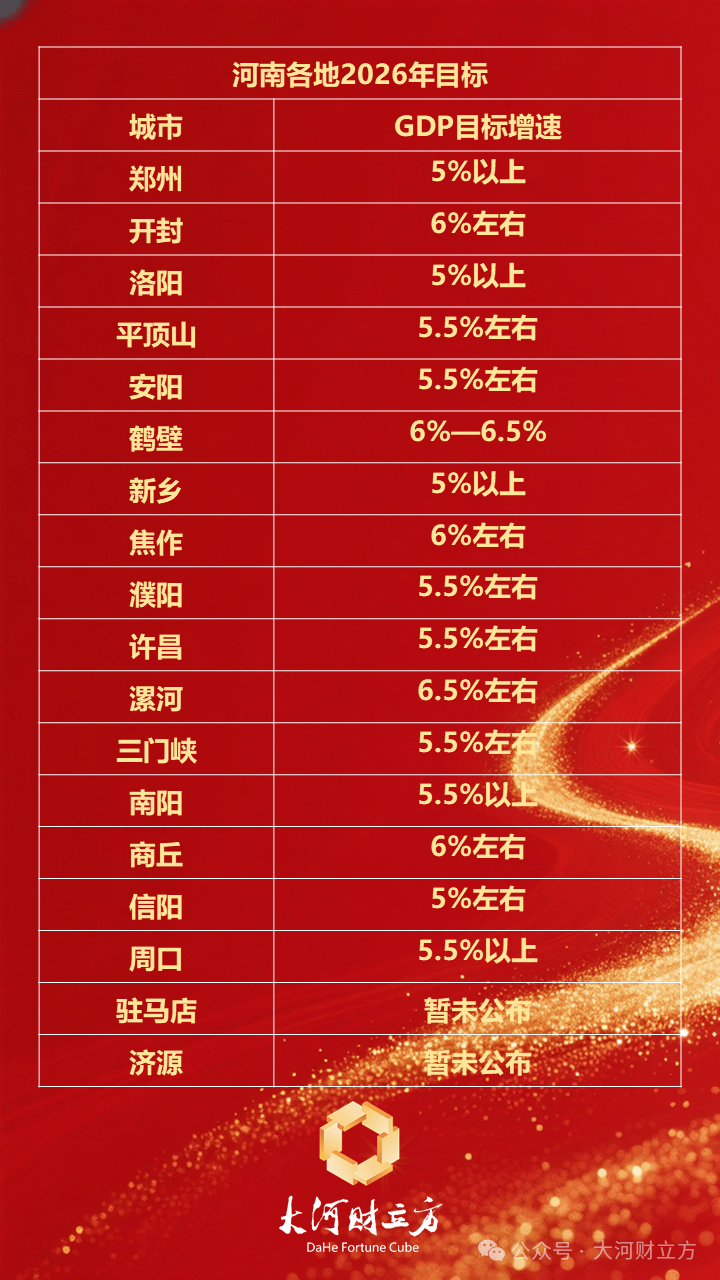2025年,河南17个省辖市和1个示范区中,共有16地GDP增速跑赢全国平均水平(5%)。目前,从已公布的政府工作报告来看,各地均将2026年GDP目标增速设定在5%左右或以上,体现了稳中求进的态势。值得一提的是,河南省2026年GDP目标增速为5%左右,各地的GDP目标增速也体现出要争相跑赢全省平均值。