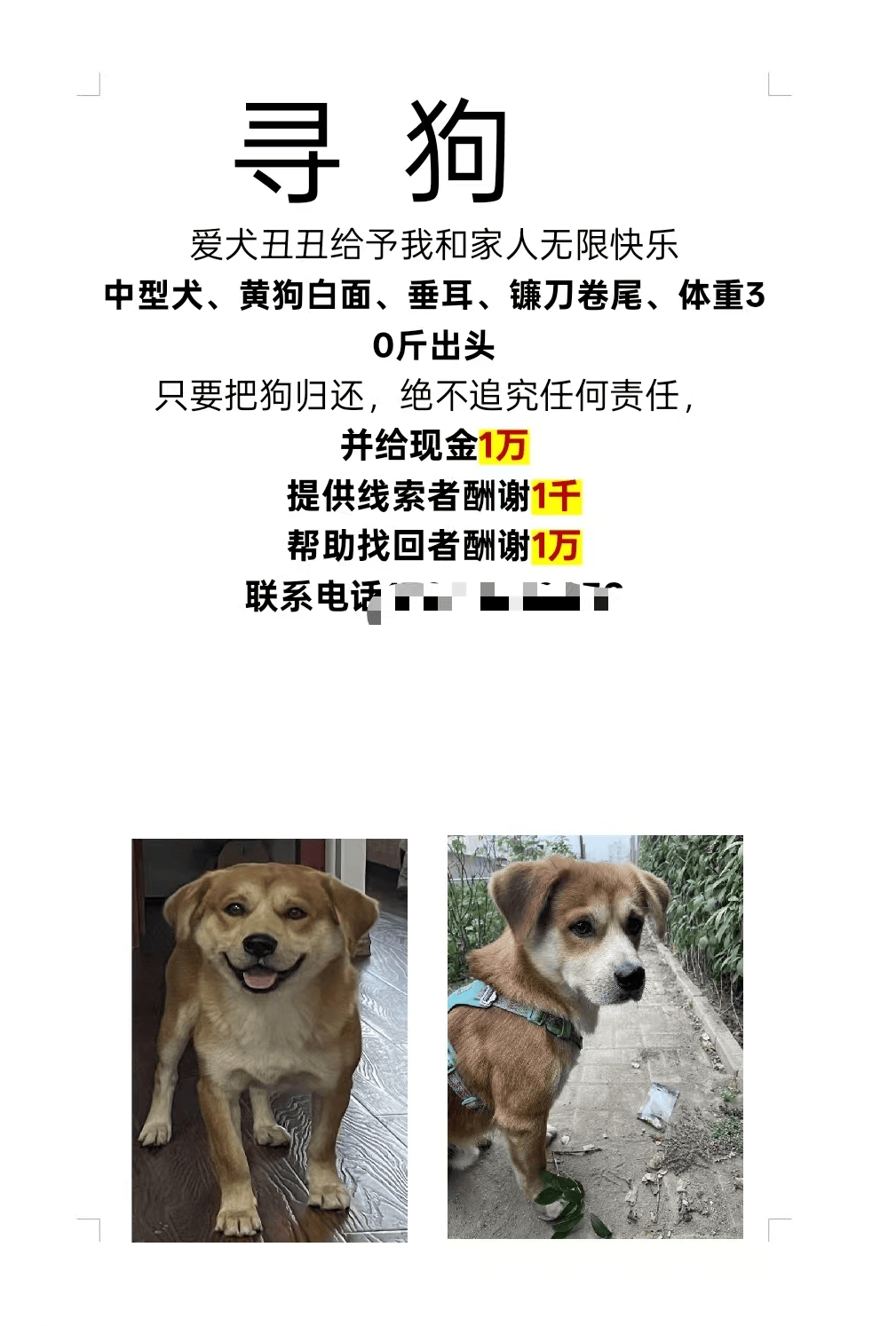 两个月来,高女士在瓦房店周边张贴寻狗启事600余张,并在多个社交媒体平台持续发布寻狗信息。寻狗启示中写明,“提供有效线索者酬谢1000元,帮助找回丑丑者酬谢1万元”。但至今,有关“丑丑”的有效线索始终未出现。