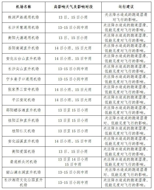 关注14日降水可能引起跑道湿滑、低能见度和15日湘北大雨、局地暴雨对飞行的影响。