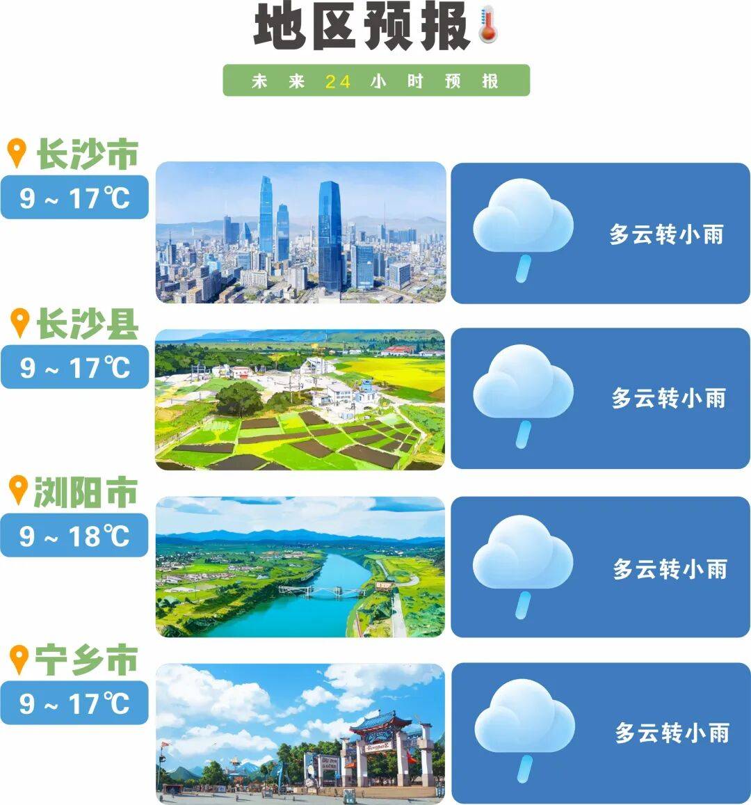 湘北多云转小到中等阵雨或雷阵雨,湘东南多云,其他地区阴天间多云有阵雨或雷阵雨;南风2~3级;最低气温湘南14~16℃,其他地区10~13℃;最高气温19~24℃。