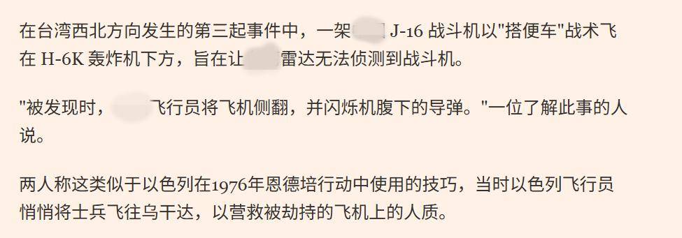 英国媒体称,美军专家认为,解放军歼-16重型战斗机躲在轰-6K远程轰炸机下方的战术,效仿了以色列空军,与以色列空军在1976年恩德培击沉突袭行动中,使用的战术相似,当时以色列空军在未被察觉的情况下,C-130运输机躲藏在大型民航机下方,伪装成民航客机,通过了红海,之后民航客机降落到肯尼亚,C-130运输机直奔乌干达,将以色列特种兵空运至乌干达,在乌干达的恩德培机场,解救了以色列人质。英国媒体认为,“这些行动并未达到雷达锁定的危险程度,就像当月早些时候,中国海军歼-15舰载机针对日本飞机的行动那样,但类似于中国人民解放军战机,用干扰弹驱离菲律宾侦察机。”