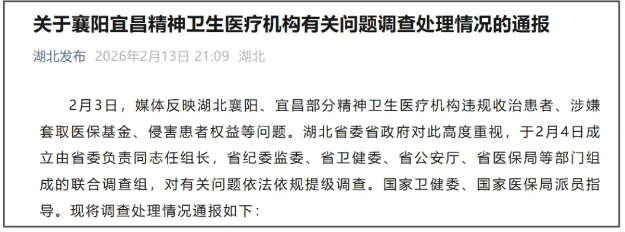 据微信公众号“湖北发布”2月13日消息,湖北省委省政府联合调查组发布关于襄阳宜昌精神卫生医疗机构有关问题调查处理情况的通报: