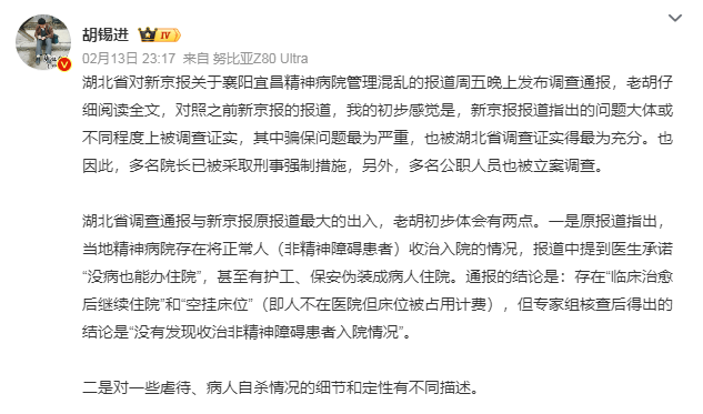 2月23日23时许,资深媒体人胡锡进在社交平台发布相关评论指出,湖北周五晚上发布调查通报,对照之前新京报的报道,问题大体或不同程度上被调查证实,其中骗保问题最为严重,也被湖北省调查证实得最为充分。