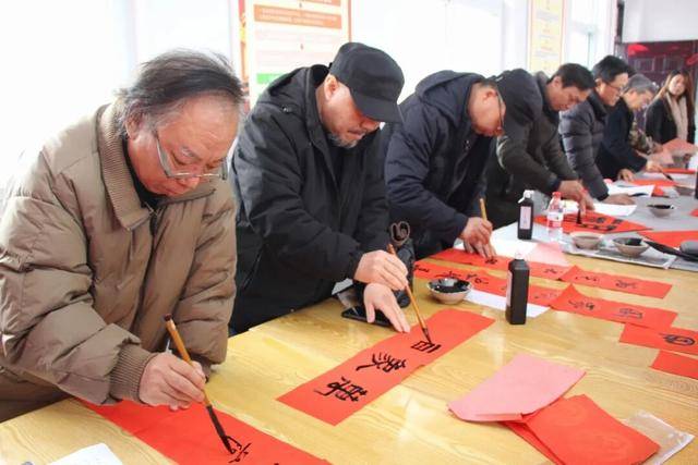 活动现场,随着书画家挥毫泼墨,“门迎百福福星照,户纳千祥祥云腾”“勤耕雨顺年年好,善种风调岁岁丰”“人兴财旺家宅旺,福满禄满岁月满”“迎喜迎春迎富贵,接财接福接平安”等一副副笔力遒劲、寓意吉祥的春联和饱含美好祝愿的“福”字跃然纸上,汪营村党员活动室内很快便墨香四溢,空气中交织着淡淡的纸香与浓郁的年味。