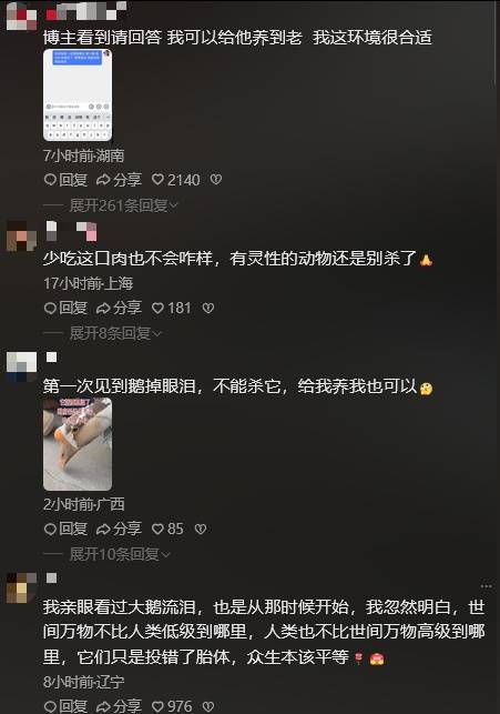 该视频在网络上引起网友关注,视频中显示众多弹幕:别杀它。有网友表示第一次见到鹅掉眼泪,“这么懂事的大鹅一定留下来,真想吃大鹅就去买一个”,也有网友表示可以收养这只鹅,“我可以给他养到老,我这环境很合适”,“不要杀了,这个鹅有灵性,不行卖给我”。还有网友在评论区分享自己养宠物鹅的经历。