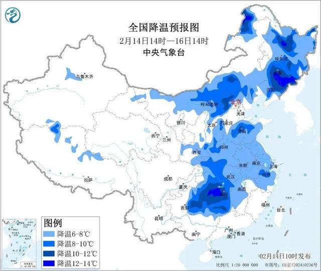 中央气象台2月14日10时继续发布寒潮蓝色预警: