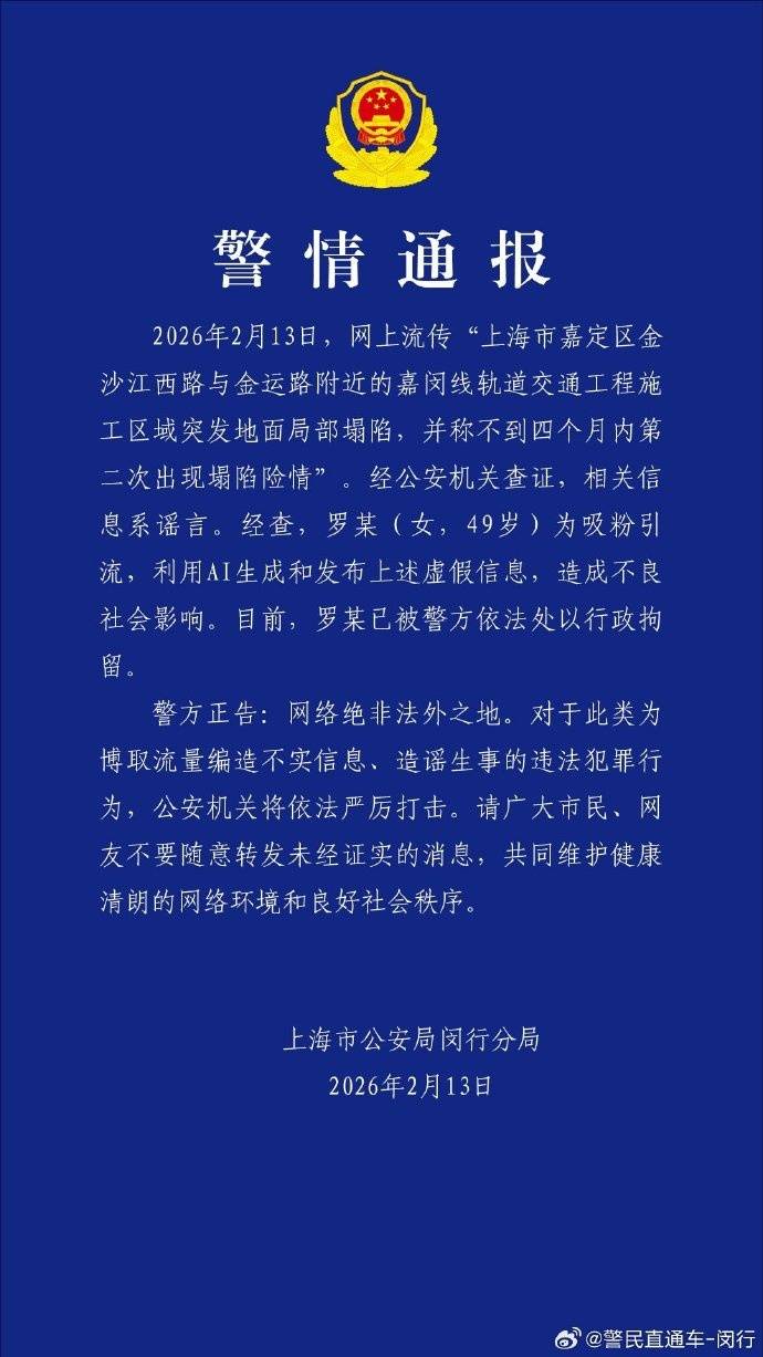 2026年2月13日,网上流传“上海市嘉定区金沙江西路与金运路附近的嘉闵线轨道交通工程施工区域突发地面局部塌陷,并称不到四个月内第二次出现塌陷险情”。经公安机关查证,相关信息系谣言。经查,罗某(女,49岁)为吸粉引流,利用AI生成和发布上述虚假信息,造成不良社会影响。目前,罗某已被警方依法处以行政拘留。