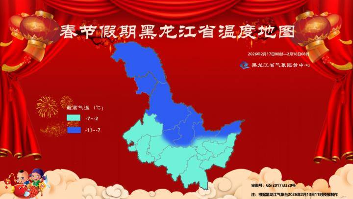 2月17日(初一):大兴安岭、黑河、伊春、绥化北部、鹤岗、佳木斯东部最高气温-11~-7℃,其他地区-7~-2℃。