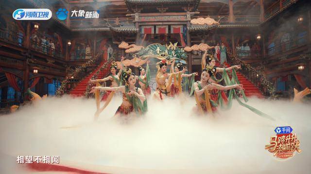 舞蹈《永乐未央》改编自同名人气舞剧片段。该剧以山西永乐宫迁建史诗为叙事主线、融合古建、壁画、琉璃、传承四重美学维度,青年舞蹈家张翰在其中化身屋檐处的“蓝釉角神”,服饰造型还原失传的孔雀蓝釉色,众舞者演绎永乐宫壁画《朝元图》上的神仙列阵,舞姿清雅,衣袂飘飞,展现“吴带当风”的空灵盛景。独具匠心的舞蹈编排,实拍与特效制作、子弹时间等技术的无缝交融,带来一场兼具文化厚度、视觉冲击与喜乐氛围的沉浸式视听盛宴。华美的神仙衣装配合独特的妆容设计,更让观众应接不暇,大饱眼福。