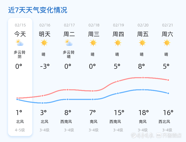 今天是2月15日,星期日,农历十二月廿八。烟台市今天天气以多云转阴为主,气温在0到1摄氏度之间,东北风4级。各区的天气情况基本一致,湿度较大,PM2.5为85,空气质量良好。市民出行时请注意保暖和防风。 明天2月16日,烟台市天气转晴,气温将有所回升,最低气温-3摄氏度,最高气温3摄氏度,北风3-4级。与今日相比,气温略有上升,天气状况有所改善。未来三天,烟台市天气趋势为晴转多云,气温逐步回升,最高温度可达18摄氏度,最低温度为-3摄氏度。市民需关注天气变化,适时增减衣物。特别提醒近期气温波动较大,市民需注意防范感冒和呼吸道疾病。出行时请注意保暖,尤其是早晨和夜间,气温较低,驾车时请保持车距,确保行车安全。