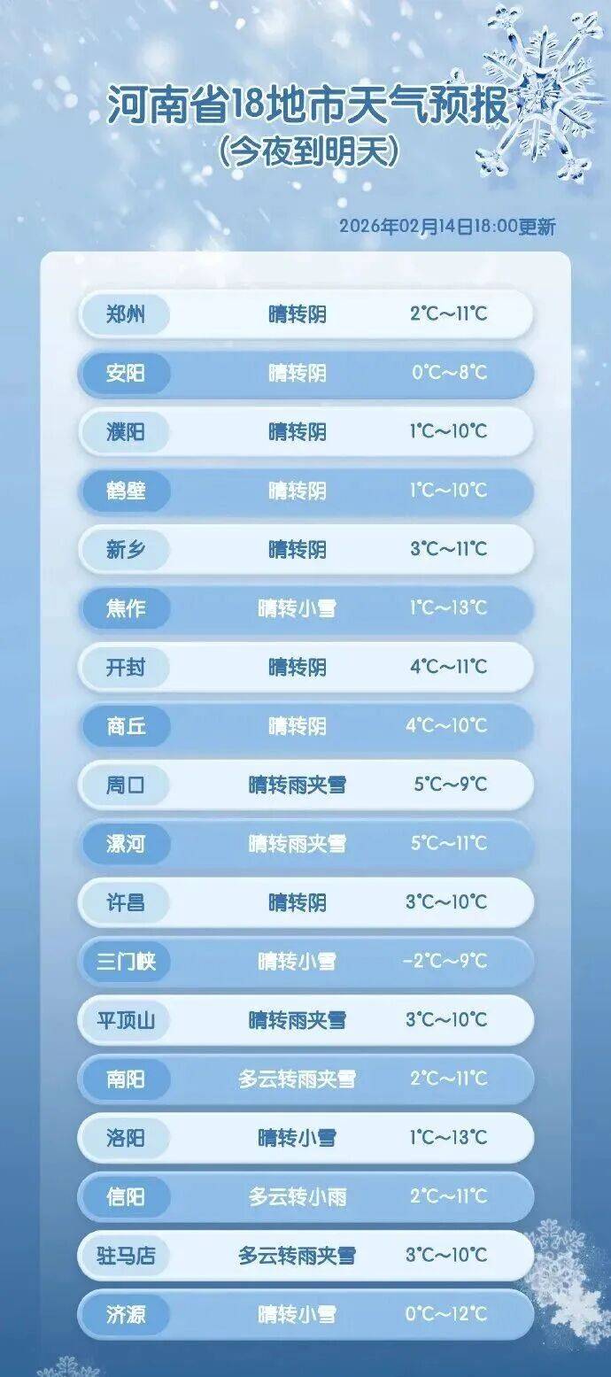 据河南气象,受冷空气和北上暖湿气流共同影响,预计15日(腊月廿八)是雨雪最强时段。西部中到大雪,局部暴雪,西南部小雨转中到大雪,东南部小到中雨,北部小雪或零星小雪,其他县市小雨转雨夹雪或小雪。