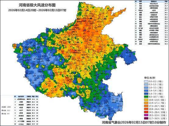 河南省气象台监测显示,2月14日20时至15日7时,我省北中部、西南部出现6到8级大风,局地9到11级。风速前三站分别为:禹州市无梁卧龙山32.2米/秒(11级)、辉县市河西28.2米/秒(10级)、卫辉市抵鹿泉27.9米/秒(10级)。